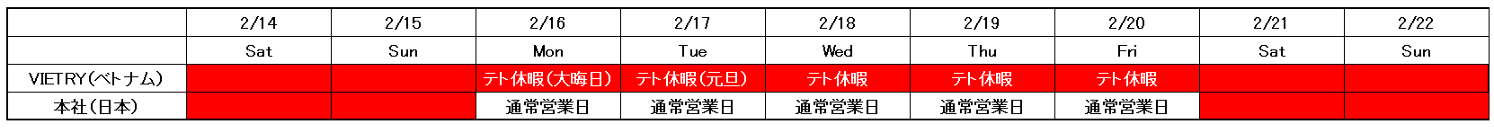 弊社ではテト(旧正月)休暇を下記の通り実施させていただきます。 営業休止中は大変ご不便をおかけいたしますが、何卒ご理解の程、よろしくお願いいたします。